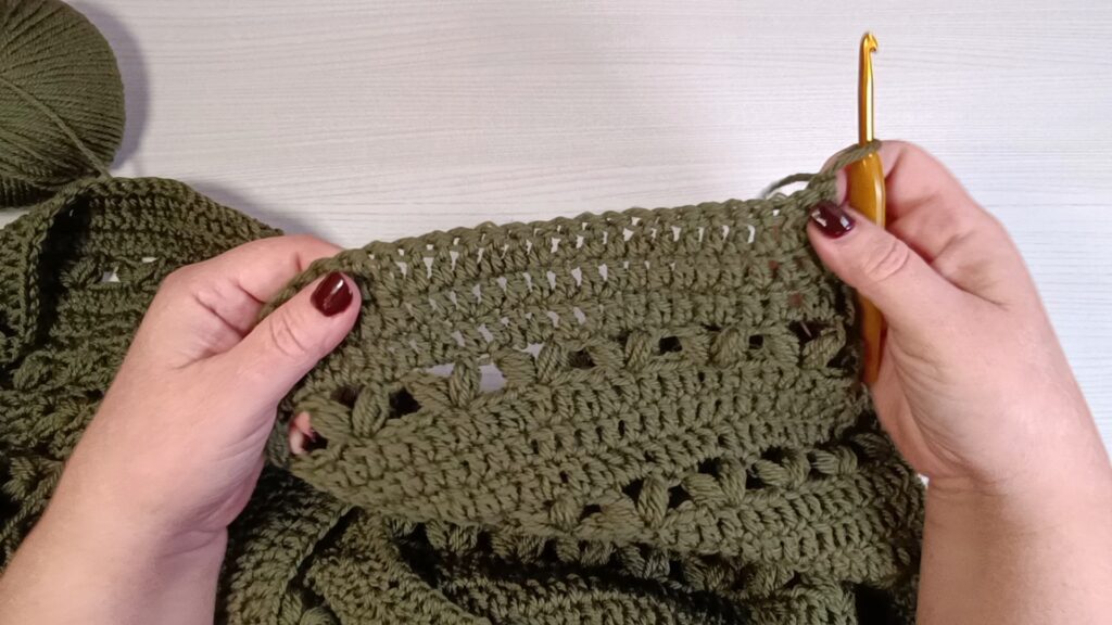 È un modello costruito dall’alto verso il basso, con aumenti progressivi controllati e alternanza di maglie alte e punto puff per dare struttura e movimento.